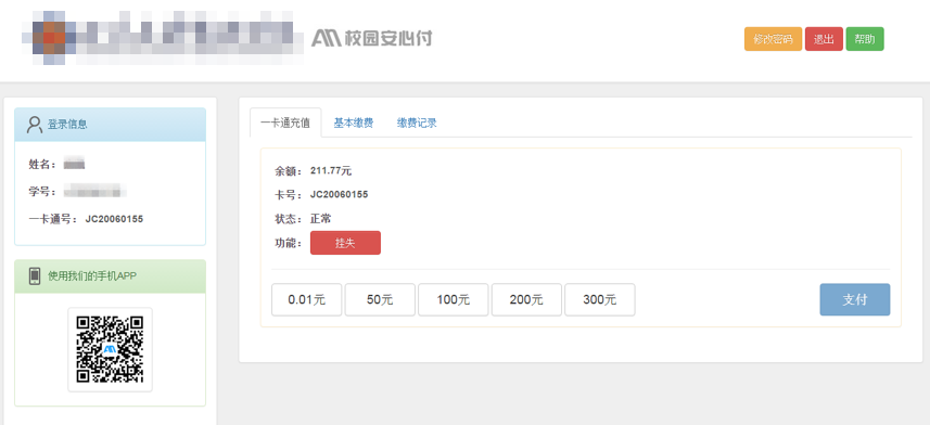 登录后,将显示一卡通余额,如下图所示,左侧可以看到自己的个人信息,右侧会有 “一卡通充值”、“基本缴费”、“缴费记录” 三大菜单。(如果学校只开通了一卡通充值或者基本缴费功能,则只会出现相关的主菜单。)