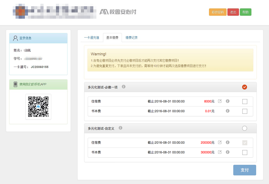 2、含有必缴项目必须先支付必缴项目后才能再次支付其它缴费项目!