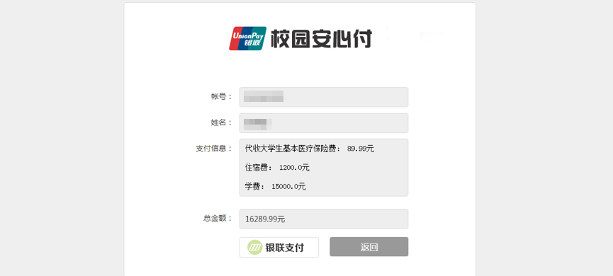 无论是充值一卡通还是缴纳学费,点击“支付”后会弹出此次充值/缴费信息详情,确认无误后点击“银联支付”。